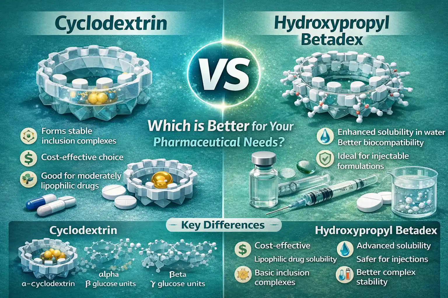 Når det kommer til farmaceutiske anvendelser, cyclodextrin oghydroxypropylbetadexer begge gode til lægemiddelleveringsmetoder på hver deres måde. Standard cyclodextriner er gode til at omslutte molekyler og er omkostningseffektive. På den anden side er hydroxypropylbetadex bedre til at opløses i vand og er mere biokompatibel. Valget afhænger af behovene i din formulering, hvor hydroxypropylbetadex giver avanceret opløselighedsforbedring for vanskelige lægemiddelmolekyler og cyclodextriner, der udmærker sig i grundlæggende inklusionskomplekser.