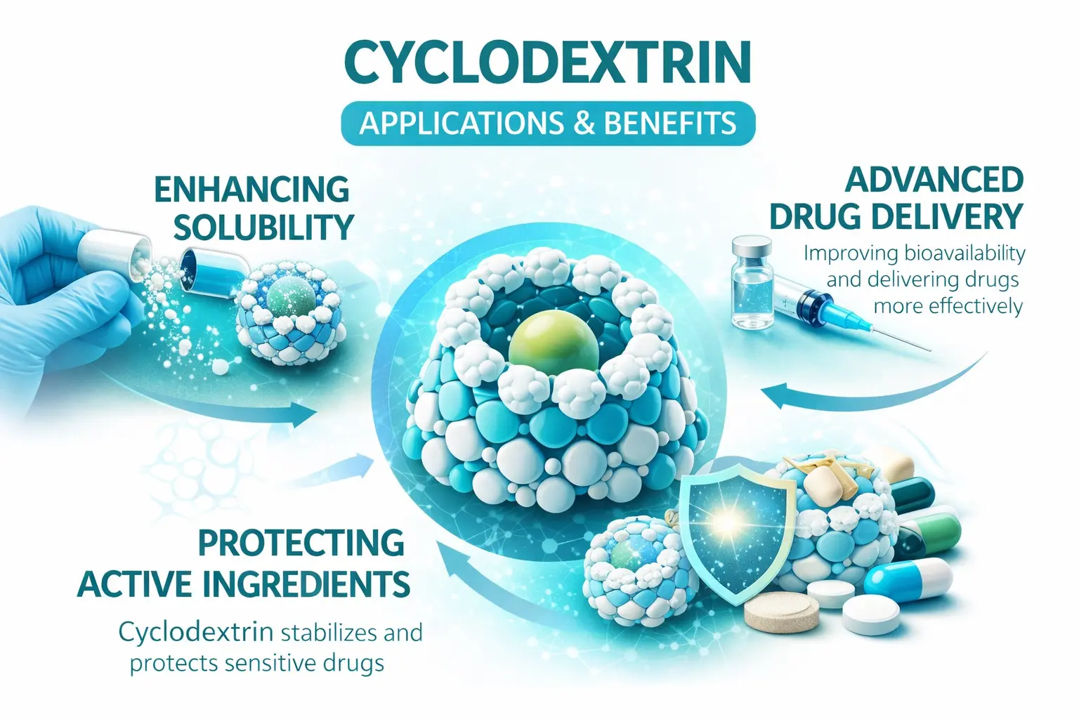 Tilføjelse af produktet til injicerbare formuleringer gør dem meget bedre. Ved traditionelle sprøjtebehandlinger er der ofte brug for organiske opløsningsmidler eller rengøringsmidler, som kan have dårlige effekter. Cyclodextriner slipper af med disse bekymringer ved at tilbyde en sikker måde at opløse ting på. Denne nye udvikling har ændret oral indgivelse af lægemidler og gjort det sikrere at give kemikalier, som tidligere var svære at administrere.